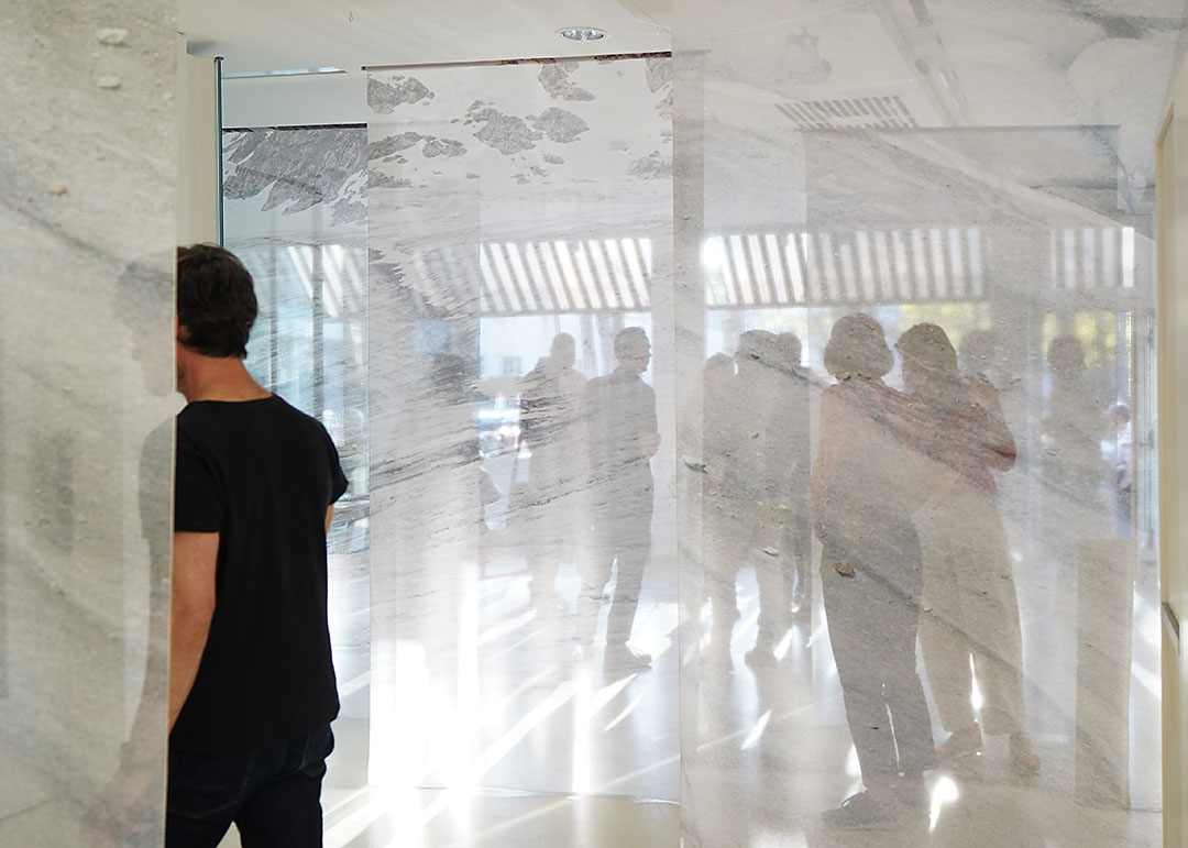 Transparente Stoffprints von Gletschern symbolisieren die Flüchtigkeit des vermeintlich ewigen Eises.